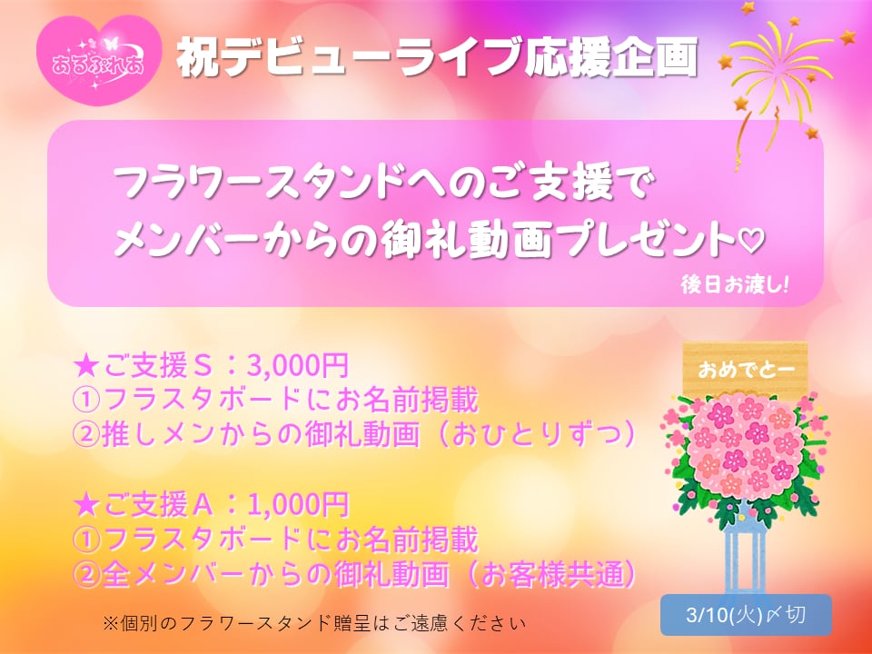 あなたの支援がデビューライブの成功につながります!このフラワースタンド支援で思い出に残る瞬間を一緒に創りましょう!